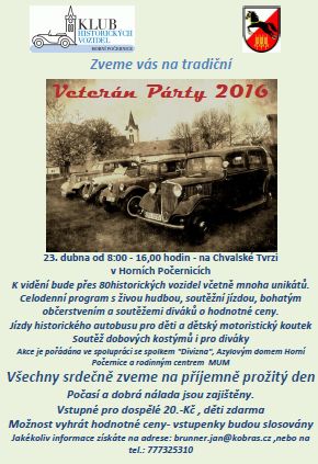 V sobotu 23.4.2016 opět úspěšně proběhla VETERANPARTY 2016. Tato akce pořádaná Klubem historických vozidel Horní Počernice ve spolupráci s Městskou částí Praha 20 a dalšími spolupracujícími organizacemi, za podpory mnoha sponzorů přilákala mnoho počerňáků strávit příjemný den na Chvalské tvrzi.