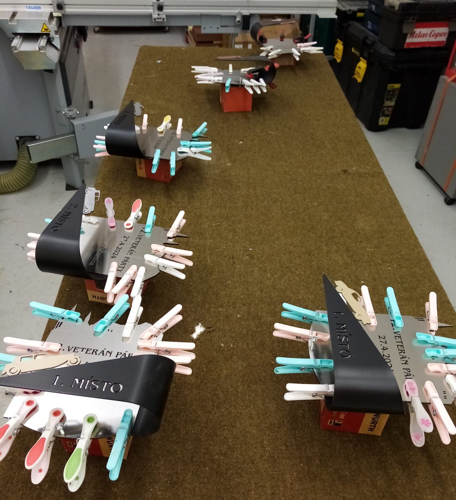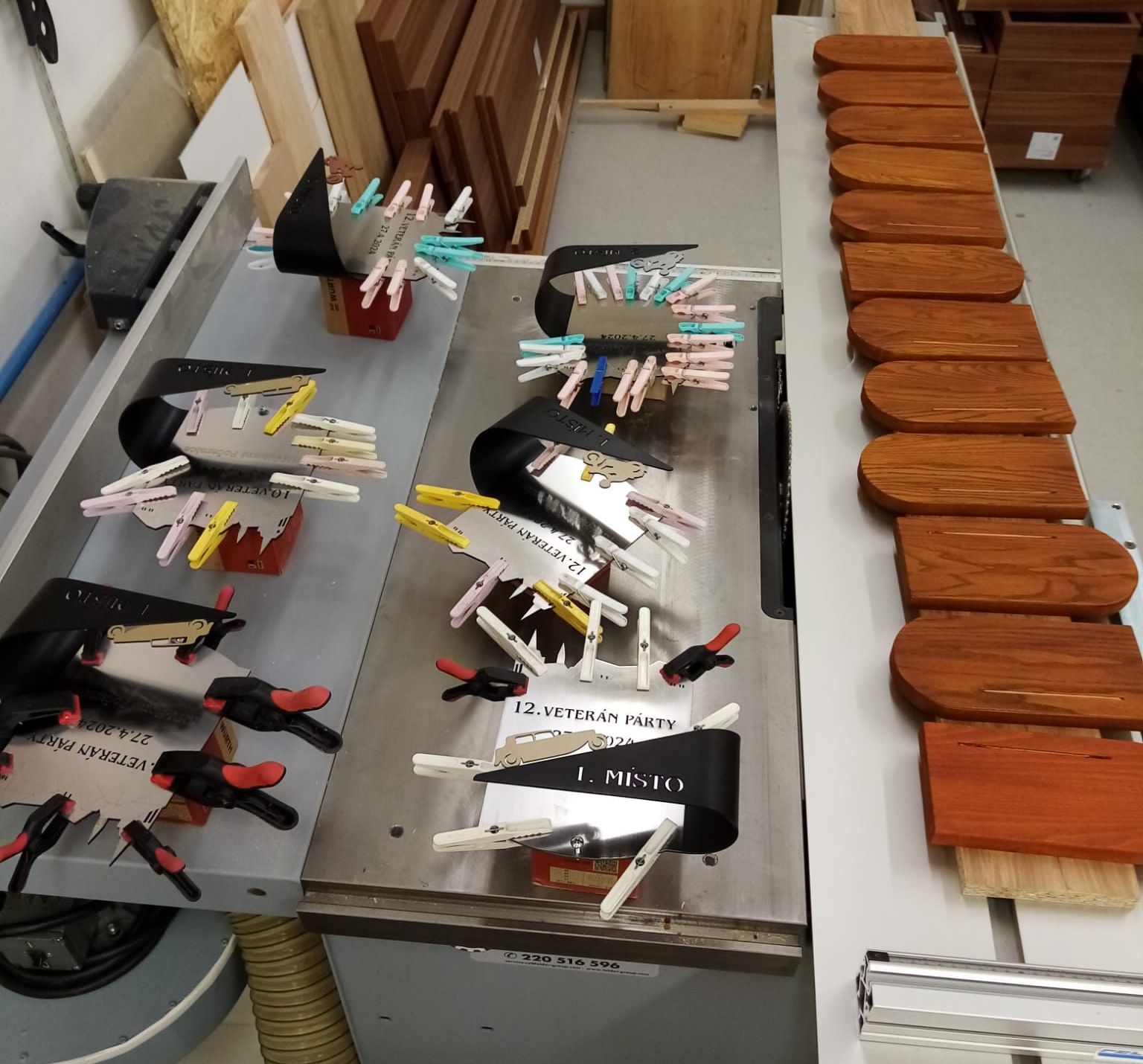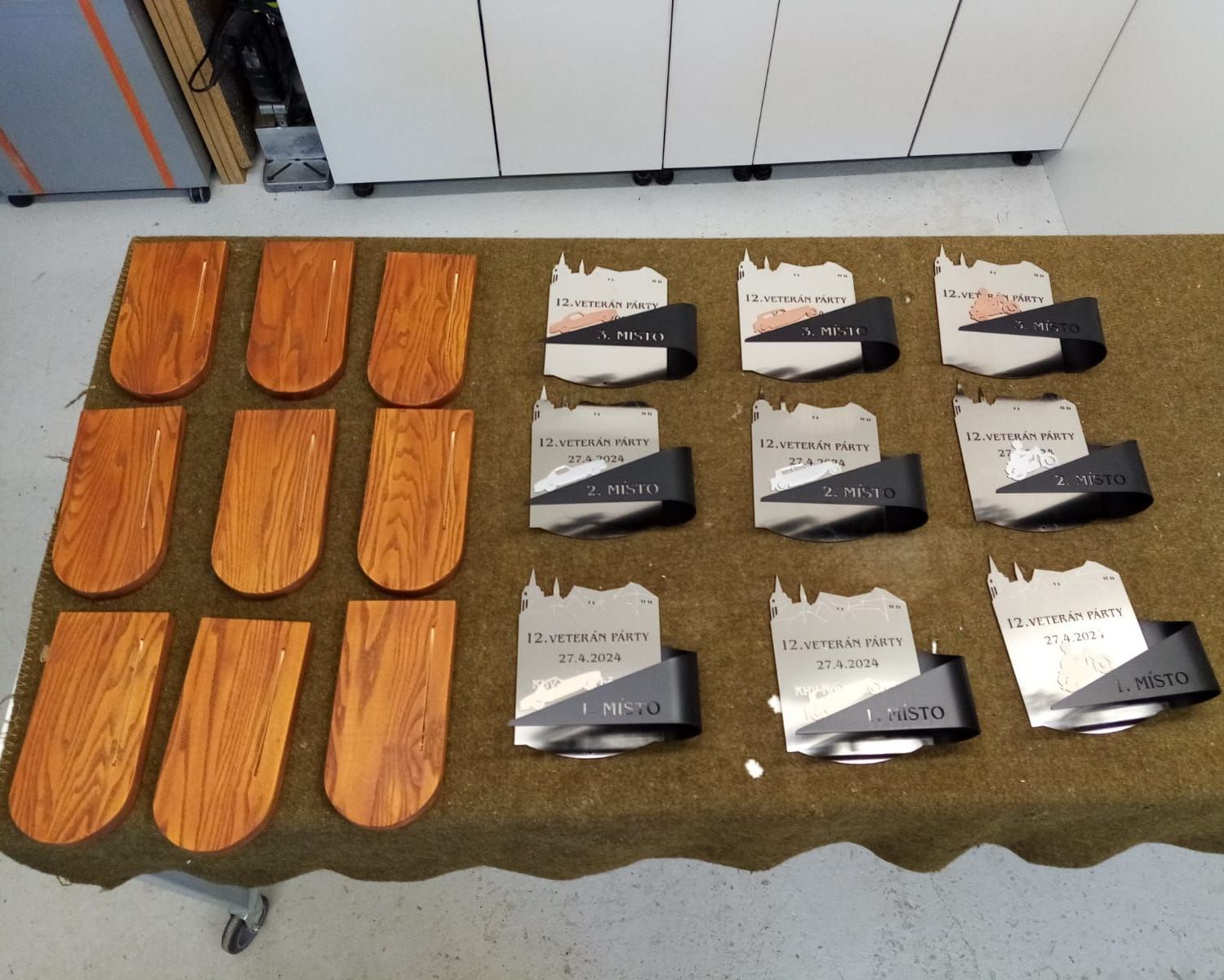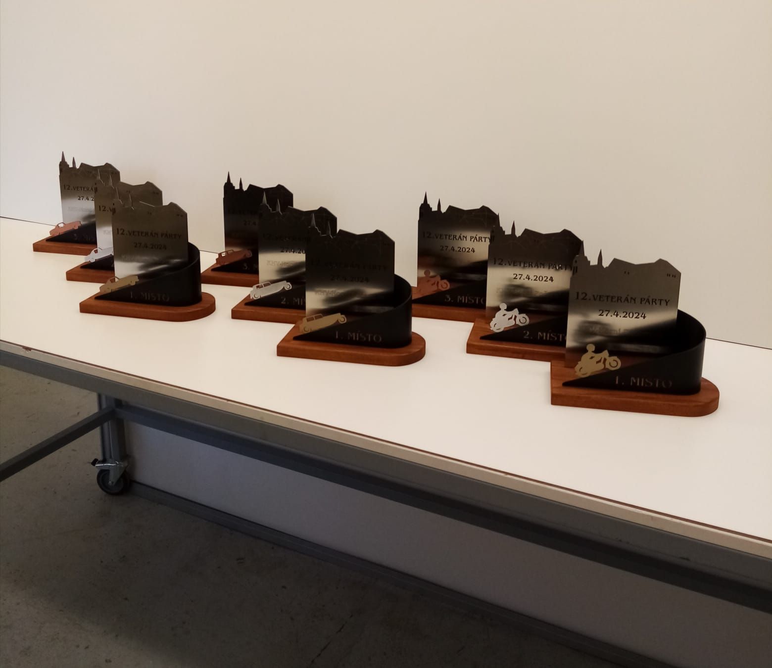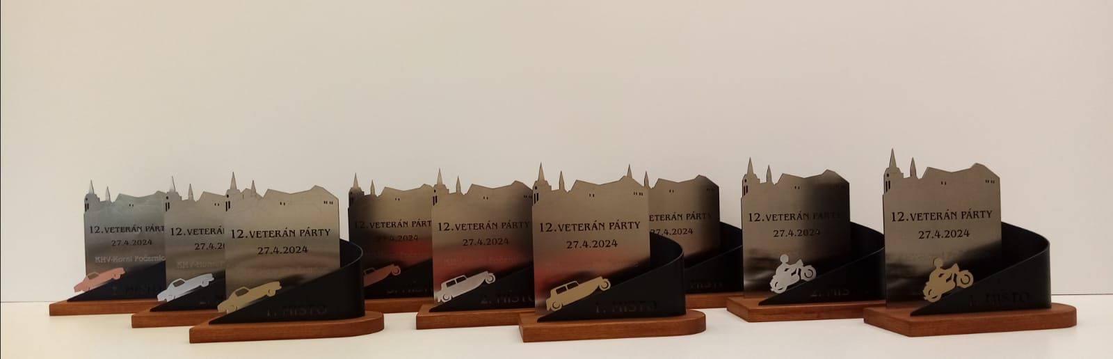 Každý ročník Vetrán Párty pro vás připravujeme s velkým předstihem. Dá to opravdu docela dost práce a organizování. A další velmi významný milník na přípravu se sešel u našich klubových řemeslníků. Nejenže zvládají funkcionáře klubu, ale navíc ručně pro Vás již třetím ročníkem připravují originální klubové poháry. Nyní se můžete podívat pod pokličku této vyroby. S precizností kováře sehnat materiál a s pomocí přesného laseru nařezat a pak každý plech přesně naohýbat, bezpečně zbrousit proti pořezání, nalakovat hned několika barvami tak, aby se navzájem nepropily a pak nechat vše dobře zaschnout. V druhé fázi se polotovary převezou ke truhláři, který vybral prvotřídní dřevo pro podstavce. To musí nařezat i s přesným rádiusem, strhnout obroušením hrany, vyfrézovat drážky a nalakovat. Pak se dva druhy kovů slepí a připevní na podstavce. Hotový výrobek se ještě finálně naleští a to vše 3x tři kategorie a pak jsou pro Vás připravené originální a výrobně velmi hodnotné poháry, které může ziskat kdokoliv z Vás, který se přihlásí včas na XII. ročník Veterán Párty 27.4.2024 a to pouze v KHV Horní Počernice...